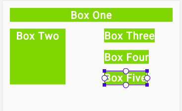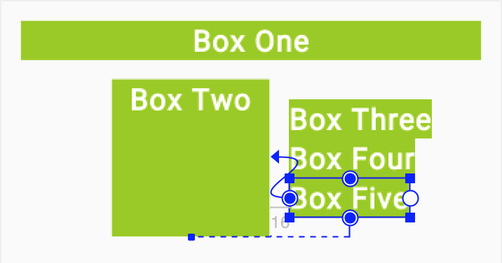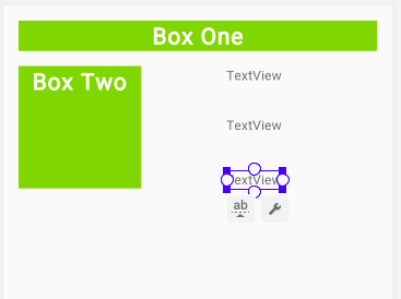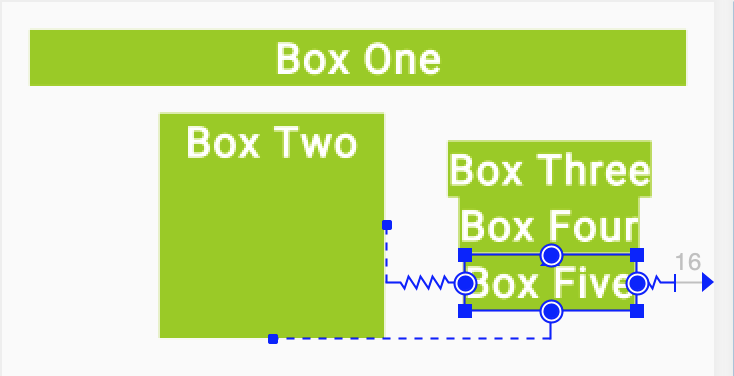 As you release the click, the constraint is created, and the new text view jumps to within 16dp of the bottom of the Box One. (The new text view has a top margin of 16dp because that’s the default you set earlier.)