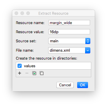 3 - Switch to the Text tab. Extract the dimension resource for layout_marginStart, and set the Resource name to margin_wide.