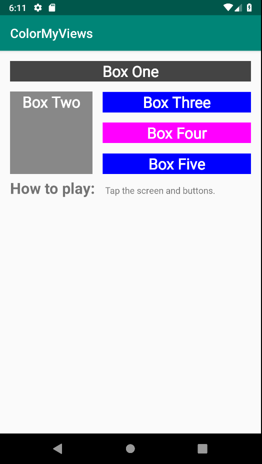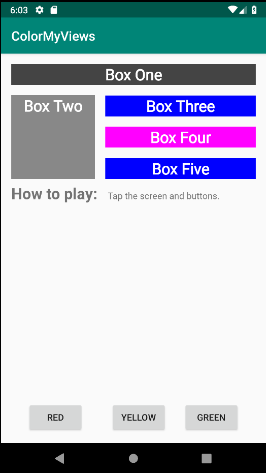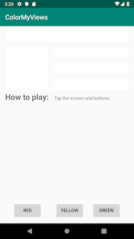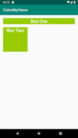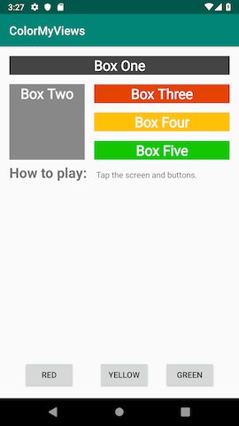 In this task, you add a click handler to each Button view. The click handler changes the color of the TextView views.