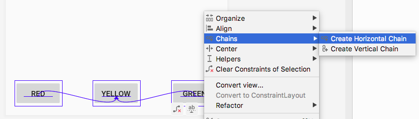 1 - In the design editor or in the Component Tree pane select all three button views and right-click. Select Chains > Create Horizontal chain.