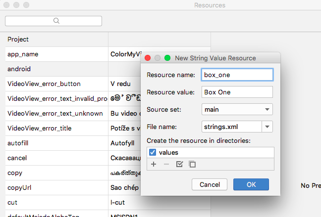 3 - In the Resources dialog, select Add new resource > New string Value. Set the resource name to box_one, and set the value to Box One.