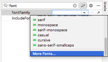 1 - In the Attributes pane, search for fontFamily and select the drop-down arrow next to it. Scroll down to More Fonts and select it. The Resources dialog opens.