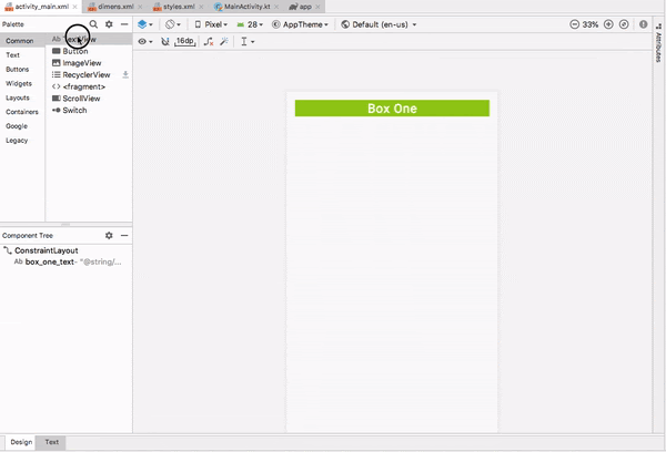 2 - Drag a TextView from the Palette pane directly into the design editor preview, as shown below. Place the text view below the box_one_text, aligned with the left margin.