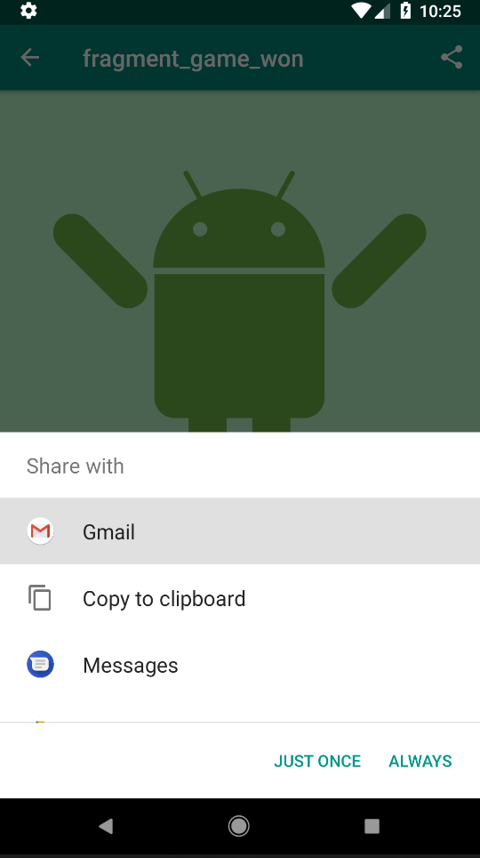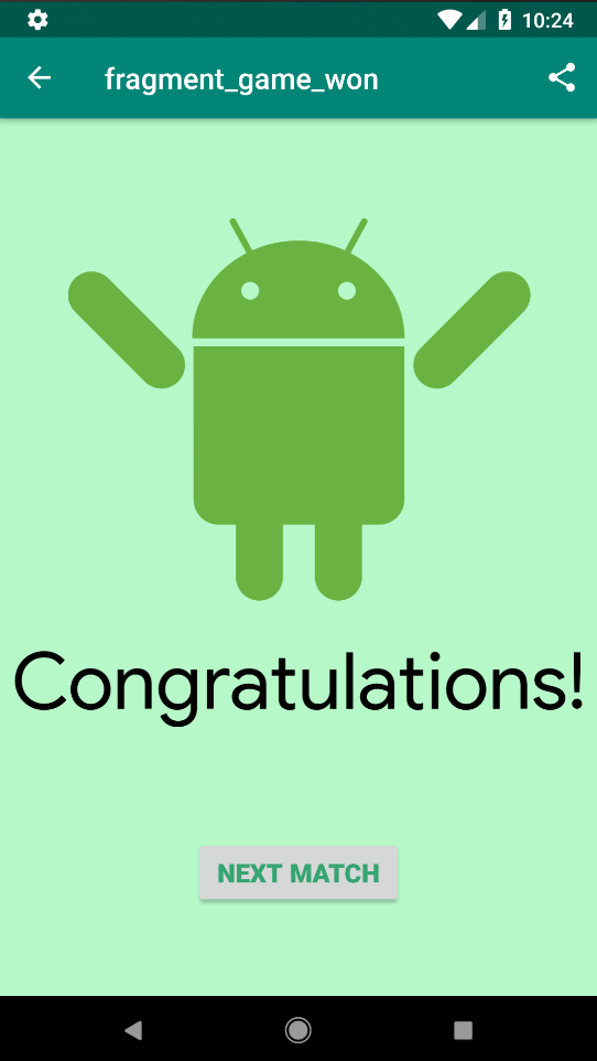 5 - Now run your app. (You might need to import some packages into GameWonFragment.kt before the code will run.) After you win the game, notice the share icon that appears at the top right of the app bar. Click the share icon to share a message about your victory.