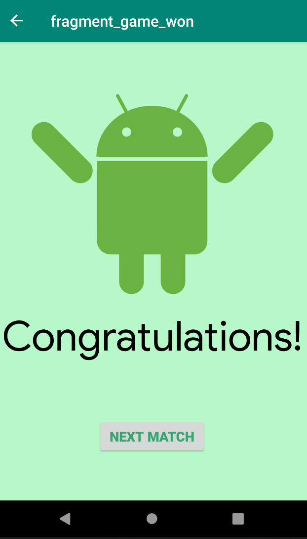 3 - In the GameWonFragment.kt file, in the Next Match button’s click handler, pass GameWonFragmentDirections.actionGameWonFragmentToGameFragment() as the navigate() method’s argument: