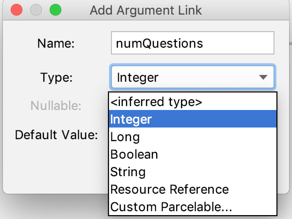 Note: If you're using Android Studio 3.2 or lower, you might have to change app:type = "integer" to app:argType = "integer" in the navigation.xml file.