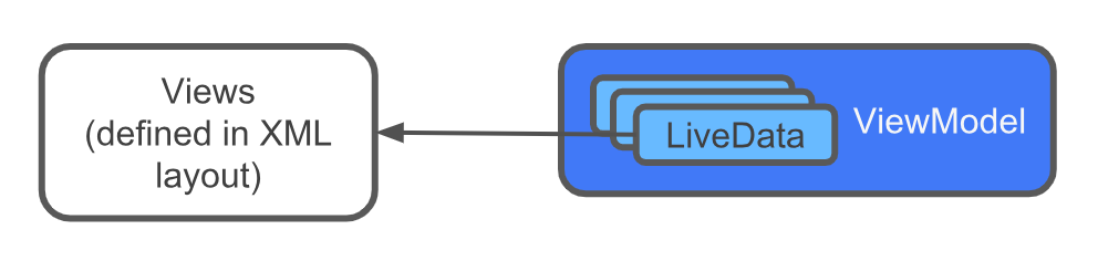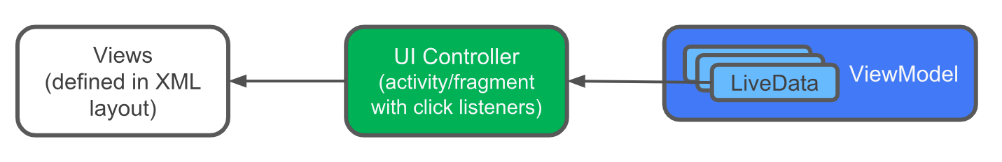 In your app, the views are defined in the XML layout, and the data for those views is held in ViewModel objects. Between each view and its corresponding ViewModel is a UI controller, which acts as a relay between them.