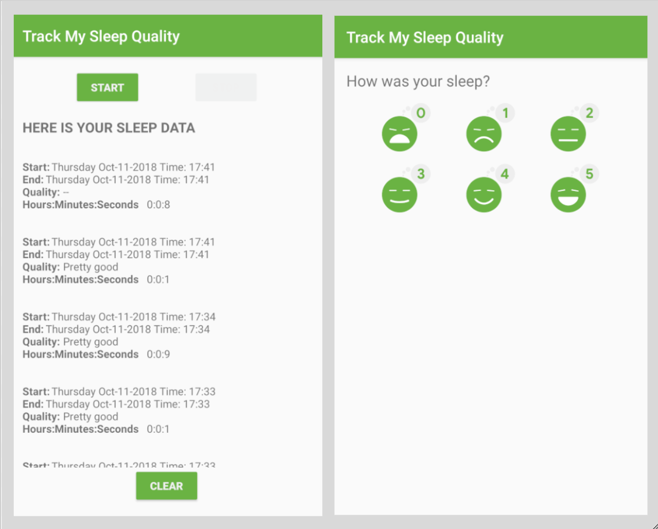 The first screen, shown on the left, has buttons to start and stop tracking. The screen shows all the user’s sleep data. The Clear button permanently deletes all the data that the app has collected for the user.