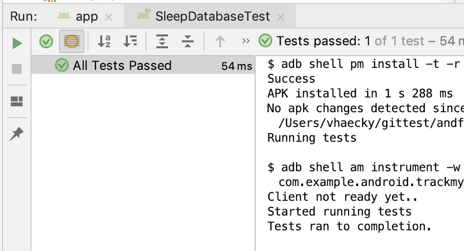 After the tests run, verify in the SleepDatabaseTest pane that all the tests have passed.