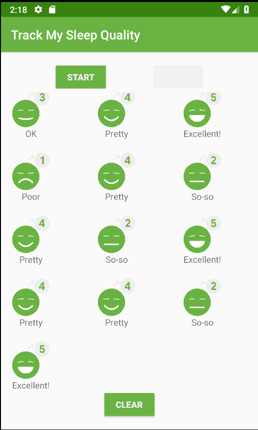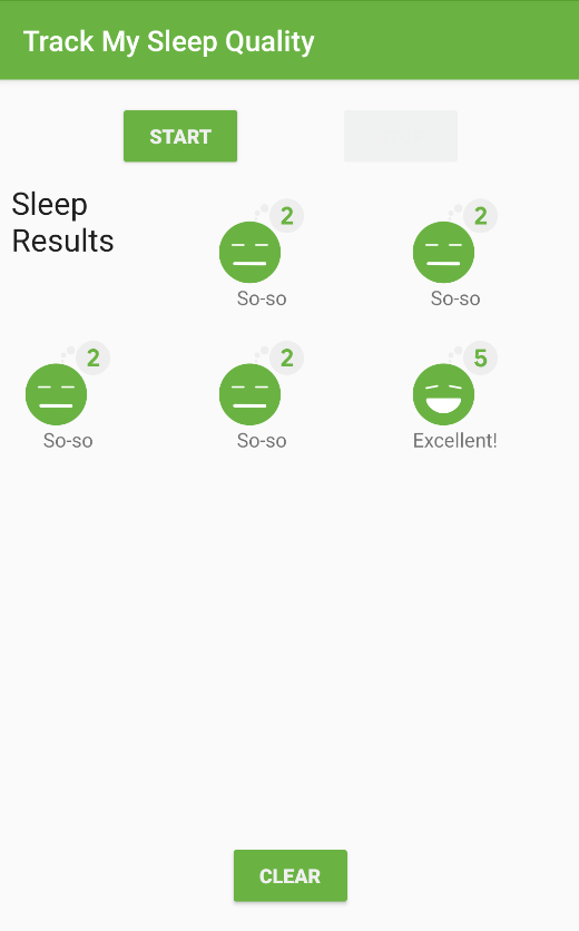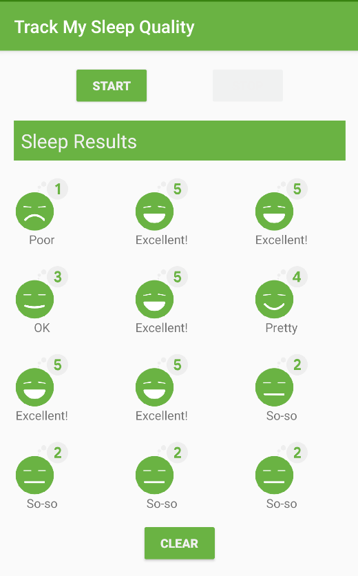 The first screen, shown on the left, has buttons for starting and stopping tracking. The screen shows some of the user’s sleep data. The Clear button permanently deletes all the data that the app has collected for the user. The second screen, shown in the middle, is for selecting a sleep-quality rating. The third screen is a detail view that opens when the user taps an item in the grid.