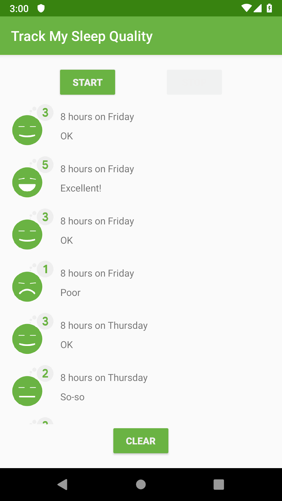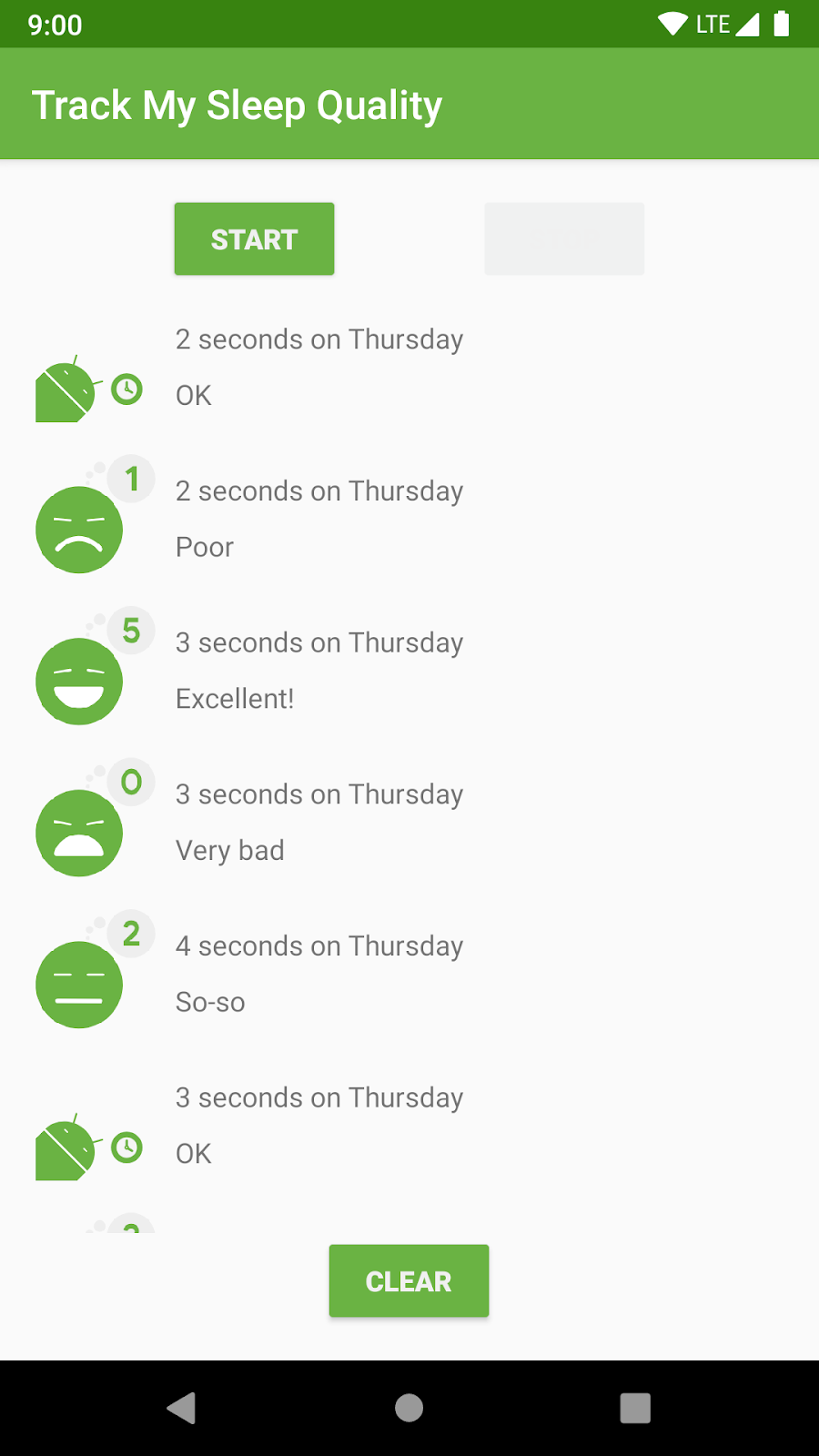 The first screen, shown on the left, has buttons to start and stop tracking. This screen also shows all the user’s sleep data. The Clear button permanently deletes all the data that the app has collected for the user. The second screen, shown on the right, is for selecting a sleep-quality rating.