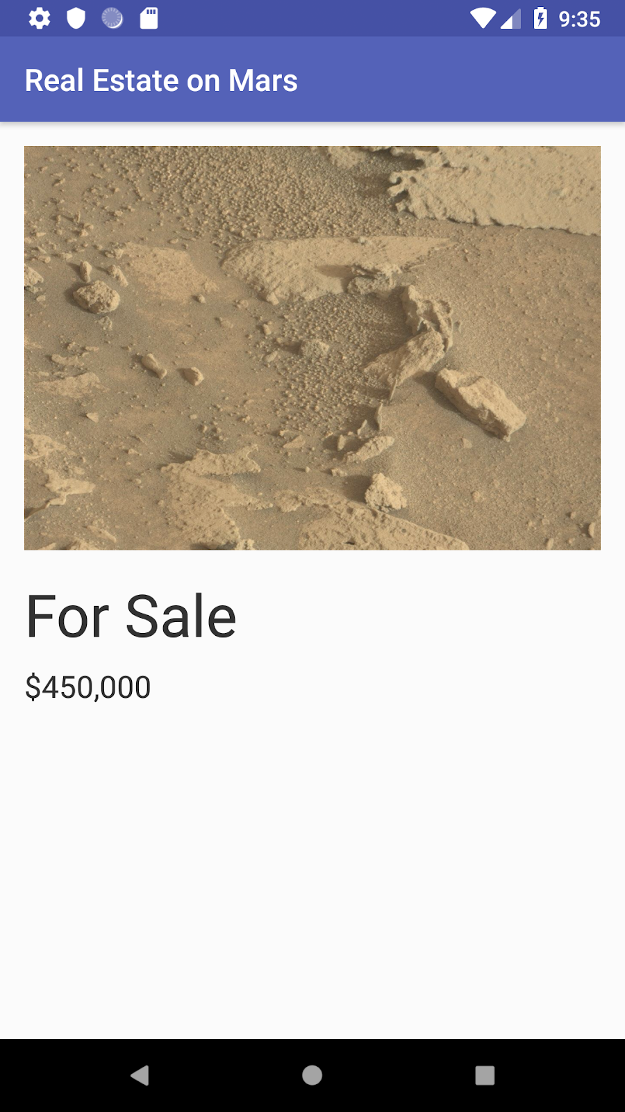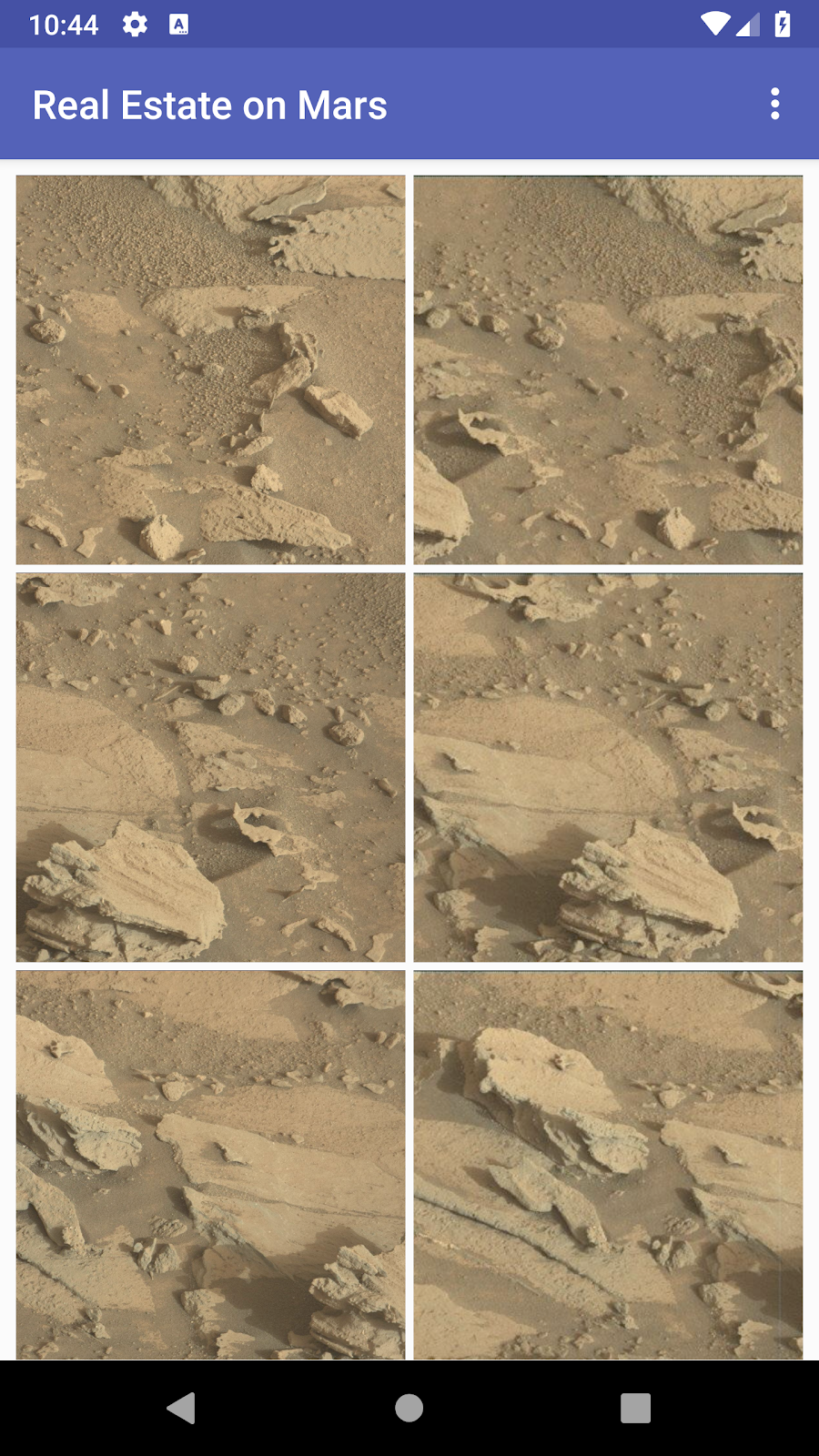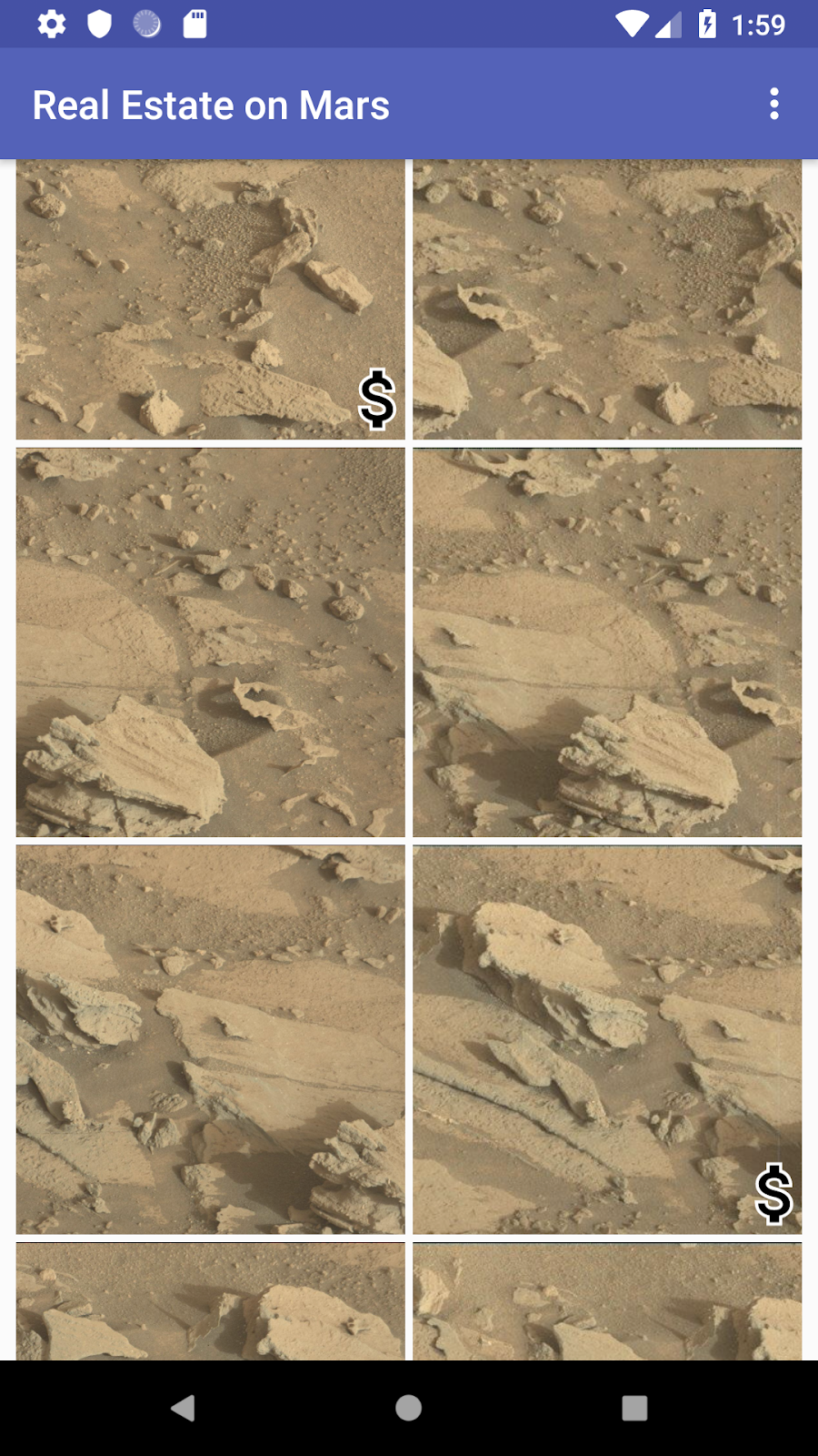 In this project (and related project) you work with an app called MarsRealEstate, which shows properties for sale on Mars. This app connects to an internet server to retrieve and display property data, including details such as the price and whether the property is available for sale or rent. The images representing each property are real-life photos from Mars captured from NASA’s Mars rovers. In previous project, you created a RecyclerView with a grid layout for all the property photos: