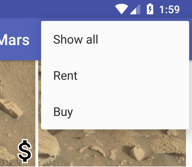 Currently your app displays all the Mars properties in the overview grid. If a user were shopping for a rental property on Mars, having the icons to indicate which of the available properties are for sale would be useful, but there are still a lot of properties to scroll through on the page. In this task, you add an options menu to the overview fragment that enables the user to show only rentals, only for-sale properties, or show all.