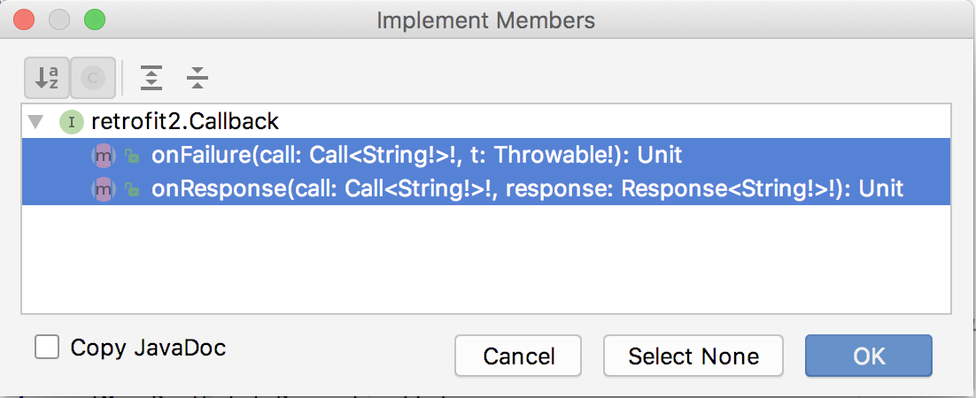 • Click on the word object, which is underlined in red. Select Code > Implement methods. Select both onResponse() and onFailure() from the list.