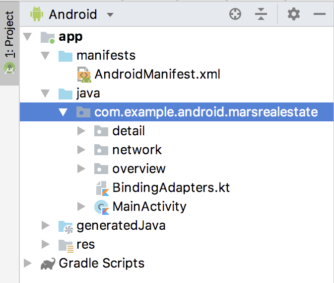 • In the Project pane, expand app > java. Notice that the MarsRealEstate app has three package folders: detail, network, and overview. These correspond to the three major components of your app: the overview and detail fragments, and the code for the network layer.
