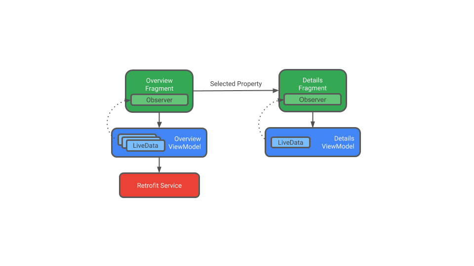The overview ViewModel is responsible for making the network call to get the Mars real estate information. The detail ViewModel holds details for the single piece of Mars real estate that’s displayed in the detail fragment. For each ViewModel, you use LiveData with lifecycle-aware data binding to update the app UI when the data changes.