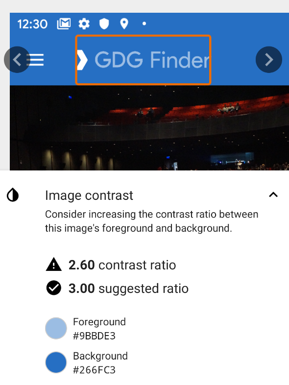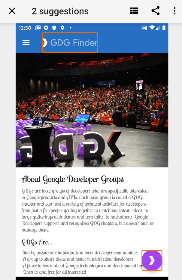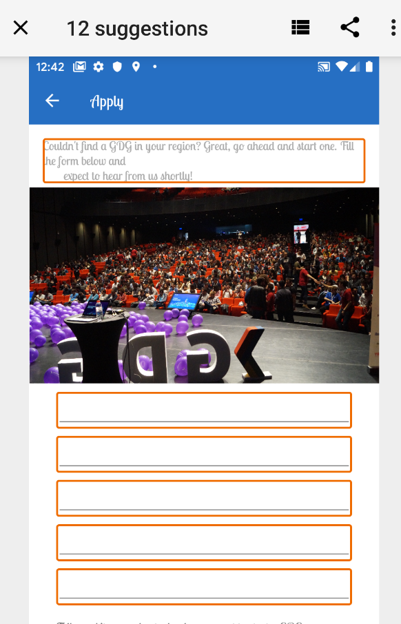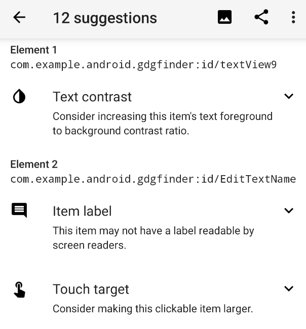 In your app, navigate to the Apply for GDG screen and scan it with the Accessibility Scanner app. This gives quite a few suggestions, as shown below on the left. 12, to be exact. To be fair, some of those are duplicates for similar items.