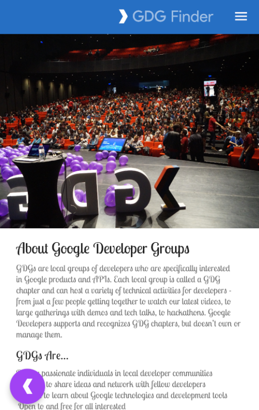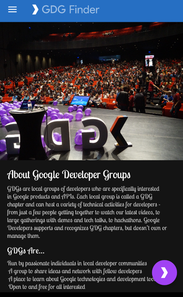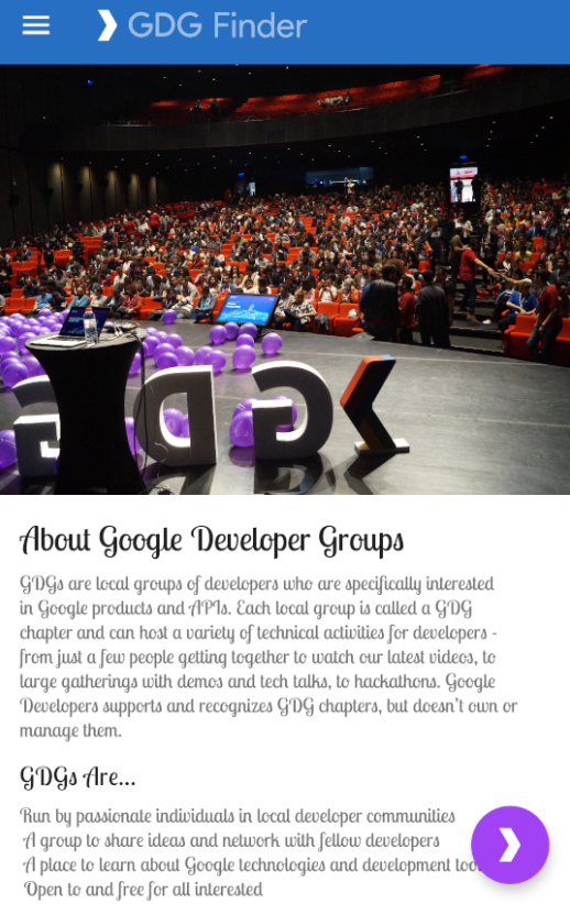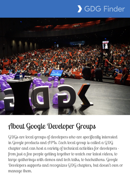 The third screen is a GDG finder. GDGs, or Google Developer Groups, are communities of developers that focus on Google technologies, including Android. GDGs around the world host meetups, conferences, study jams, and other events.