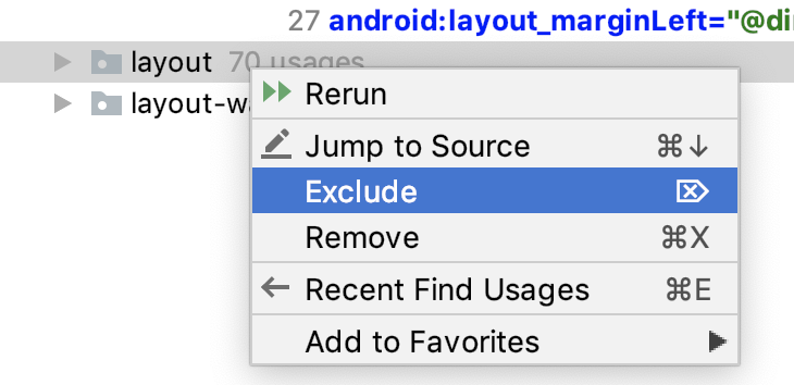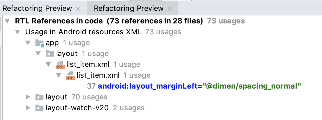 Under the app folder, notice that the layout_marginLeft that you just changed is listed as code to refactor.