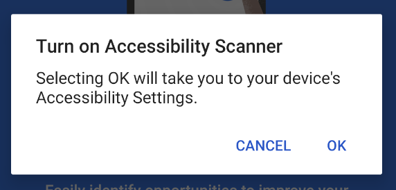 Click OK to start Accessibility Scanner setup in Settings.