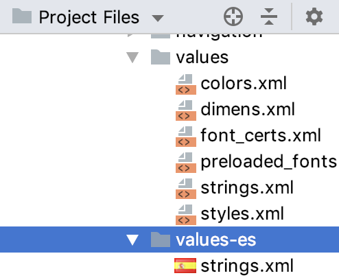 Expand the res folder, and notice folders for res/values and res/values-es. The “es” in the folder name is the language code for Spanish. The values-“language code” folders contain values for each supported language. The values folder without an extension contains the default resources that apply otherwise.