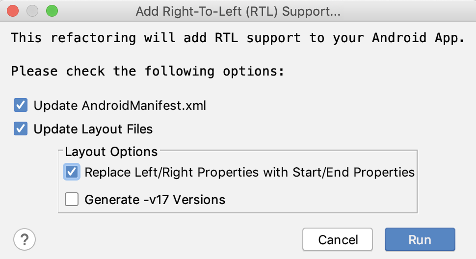 In the previous exercise, you took your first steps to support RTL languages. Fortunately, Android Studio can scan your app and set up a lot of basics for you.