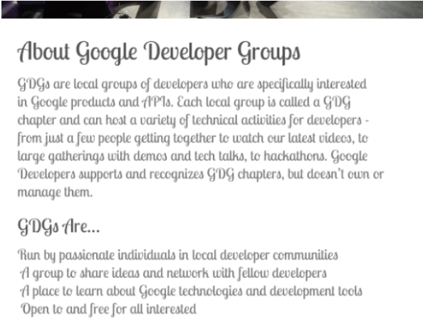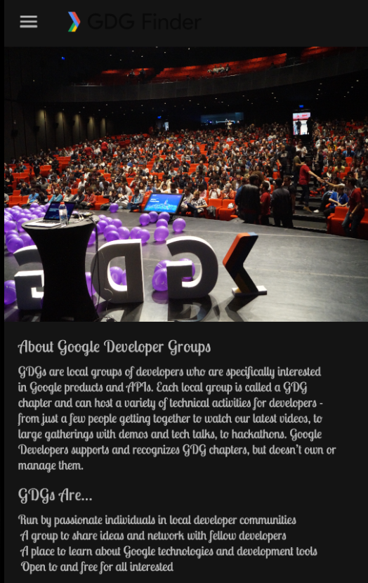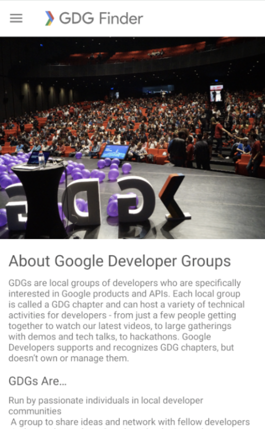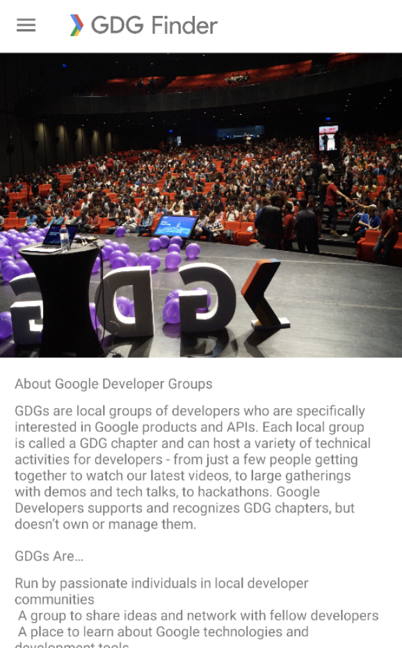 The third screen is a GDG finder. GDGs, or Google Developer Groups, are communities of developers that focus on Google technologies, including Android. GDGs around the world host meetups, conferences, study jams, and other events.