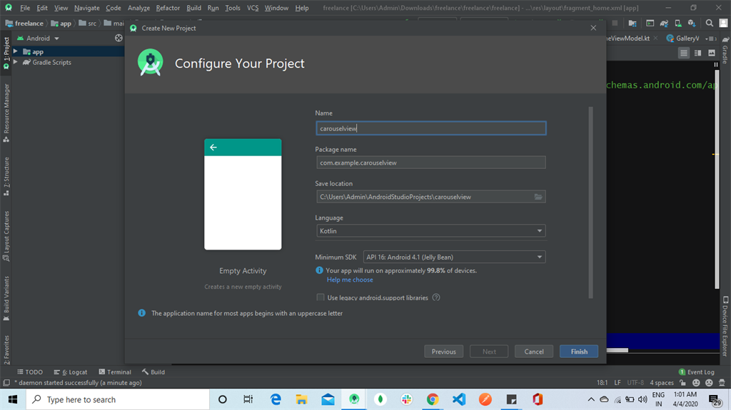 You can choose your application name and choose where your project is to be stored. Choose Kotlin language for coding the project. Now, select the version of Android and select the target Android devices, then click the “Finish” button.