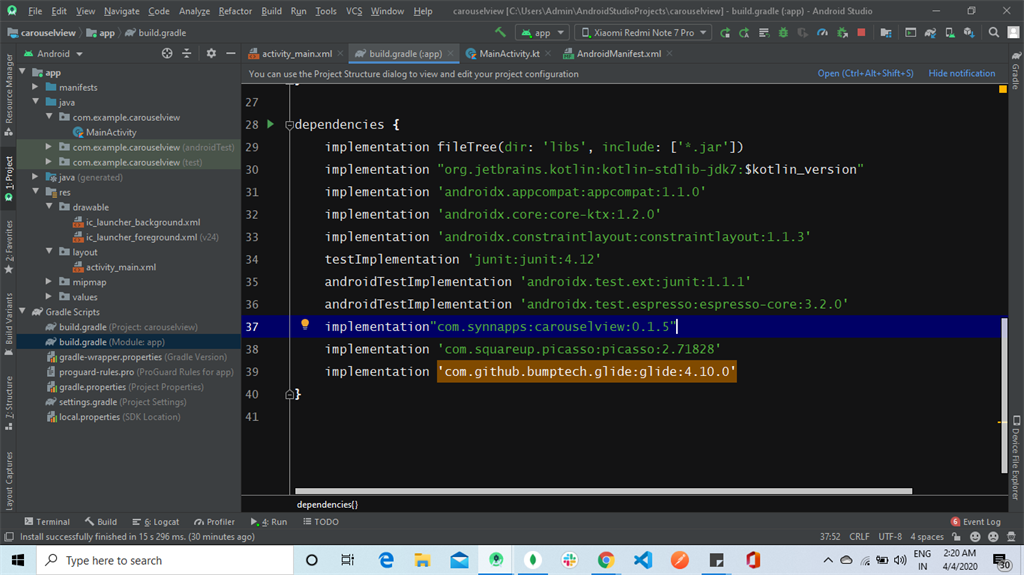 Go to the build.grade file. Add third party dependencies for carouselview and Picasso.